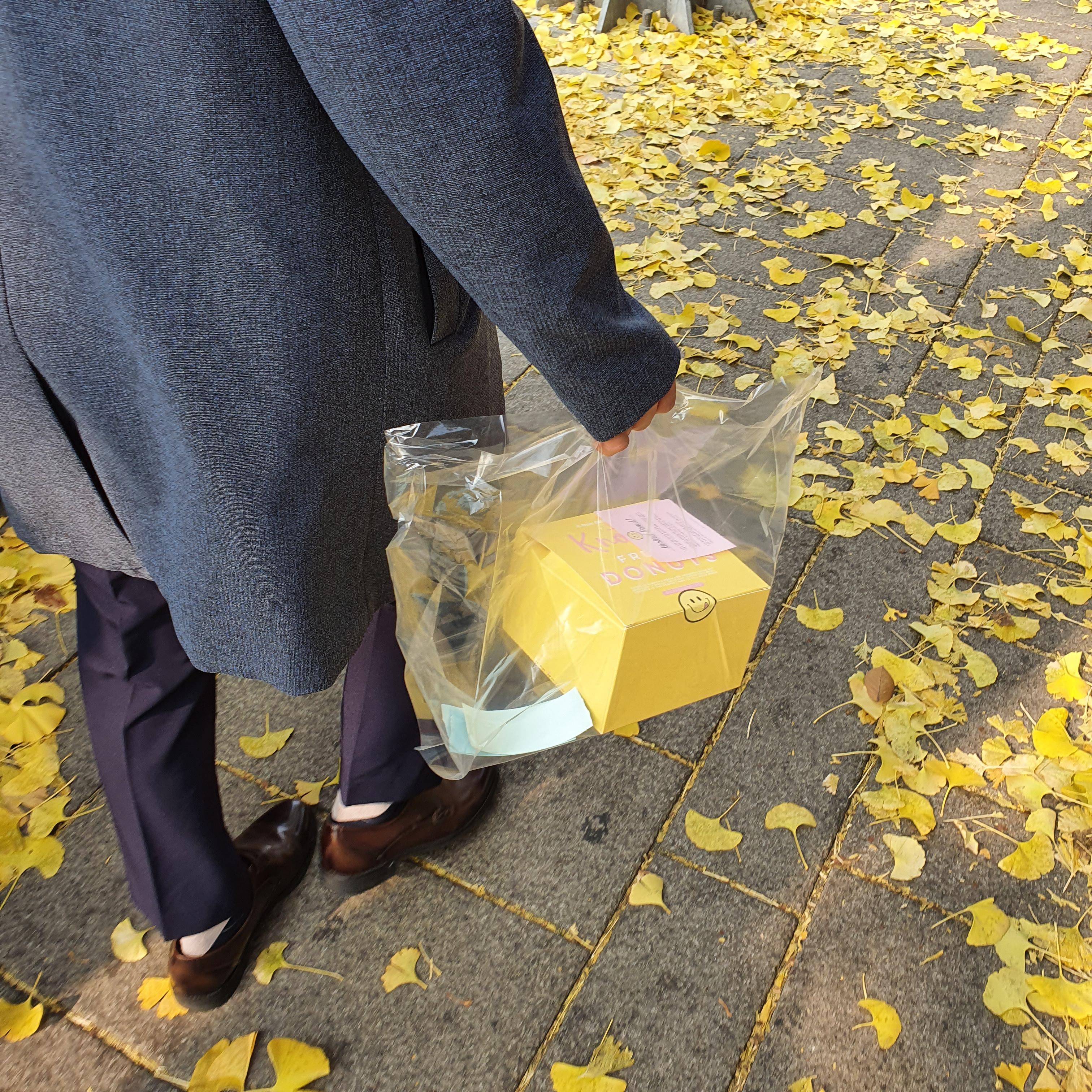 노오란 은행잎이 길바닥을 물들이고 있었는데 그 위로 노란 노티드 도넛 박스를 가지고 돌아왔다.