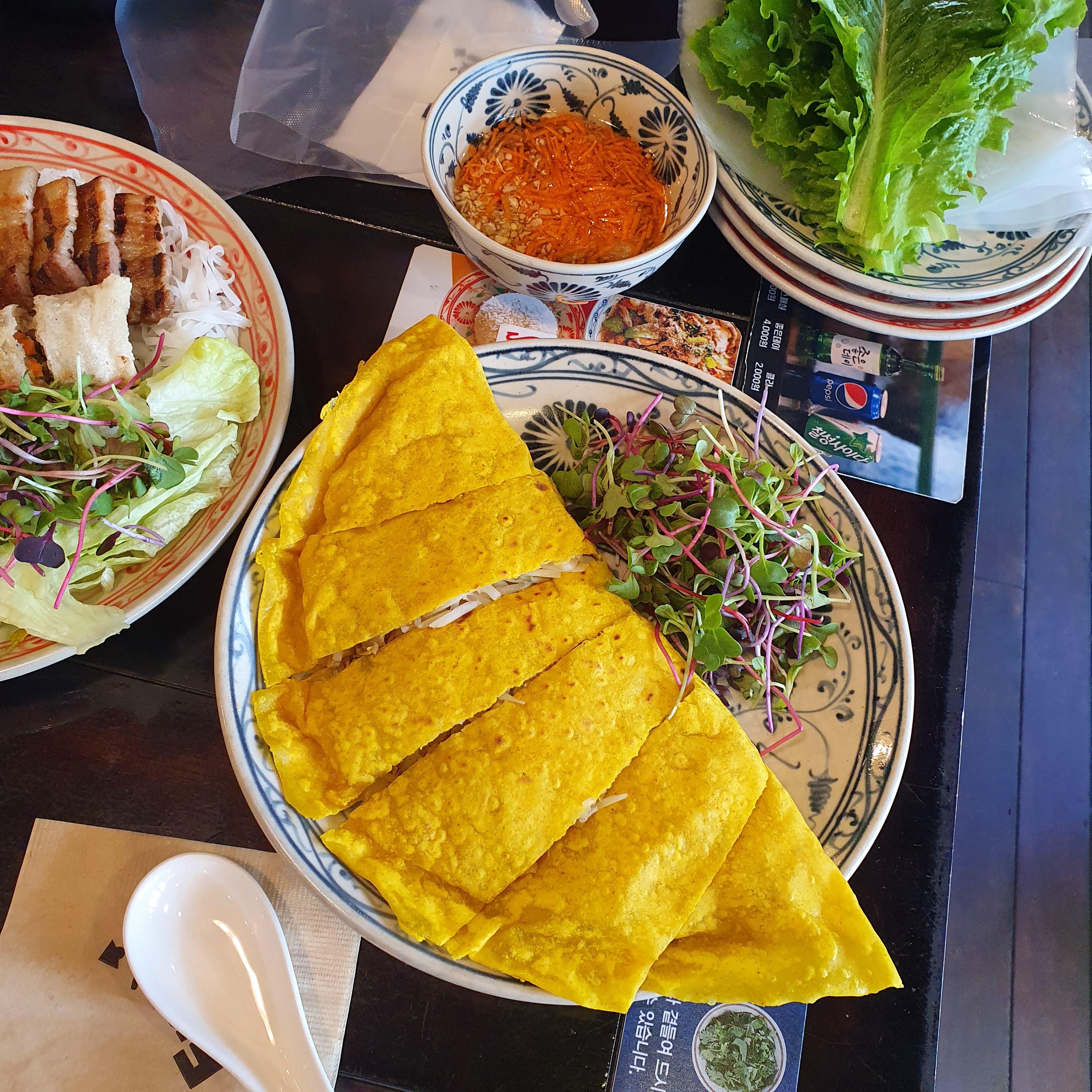 쌀국수랑 분짜랑 먹다보니 주문한 반쎄오가 나왔어요. 반쎄오는 저도 처음 먹어봤는데요, tv에서 보던것처럼 막 맛있지는 않더라고요. 그래도 나름 즐기면서 먹었어요. 반쎄오는 계란을 얇게 부쳐내고 그 안에 숙주와 고기 등등을 넣은 베트남식 부침개라고 생각하시면 돼요.