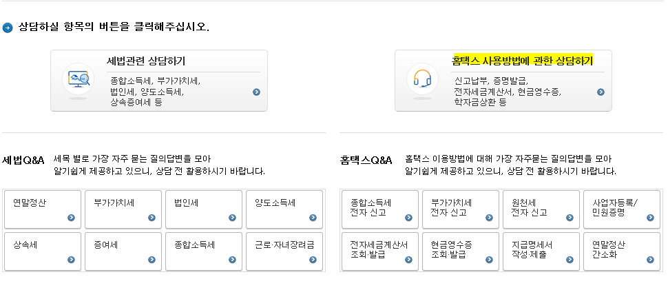 그리고 홈택스 사용방법에 관한 상담하기 를 누릅니다.