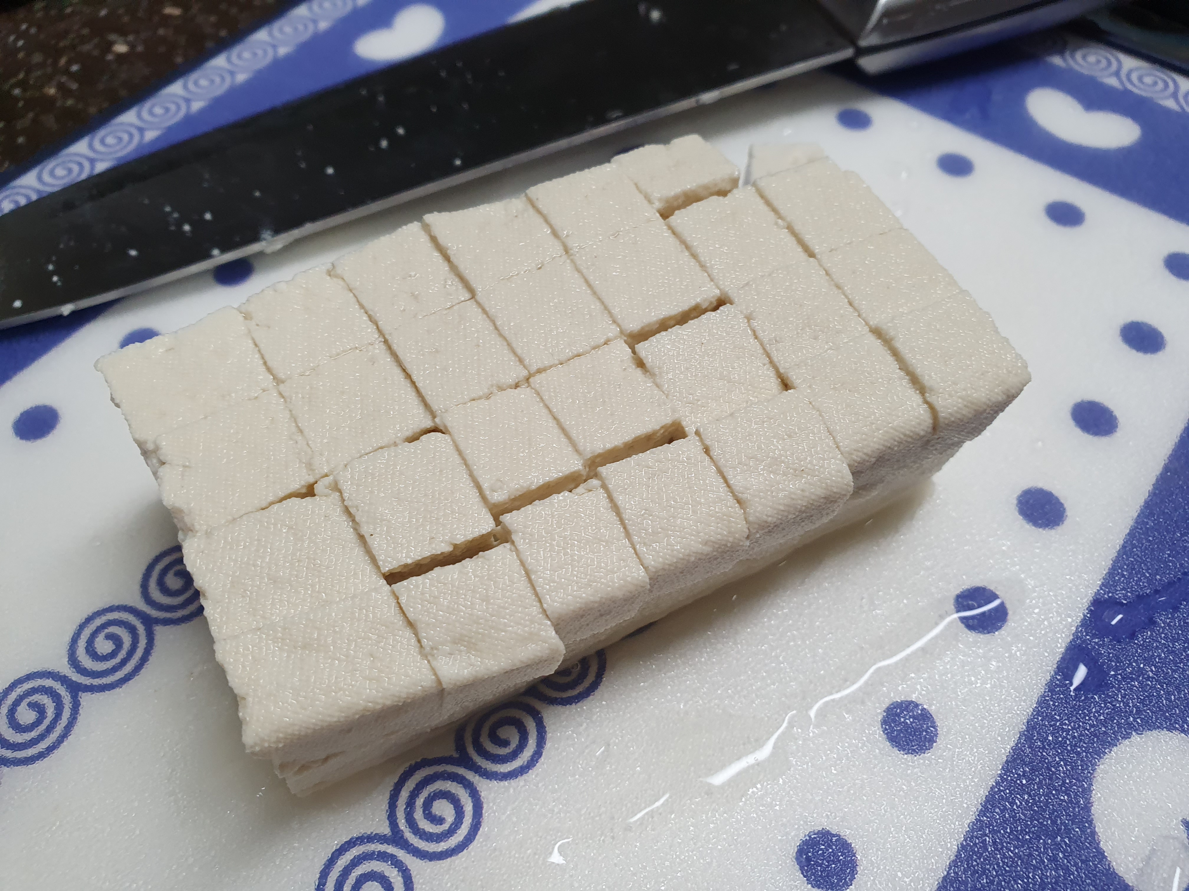 그리고 깍둑썰기를 해서 준비해놓은 부침용두부를 넣어서 같이 볶아주는데요, 이때 물을 재료가 잠길 정도로만 넣어서 충분히 양념이 베일때까지 볶아주세요. 이때 전분가루를 넣어서 농도를 조절해주셔야하는데 저는 전분가루도 없어서 패스해주었어요. 전분가루 이제 구입할게요 하하하.