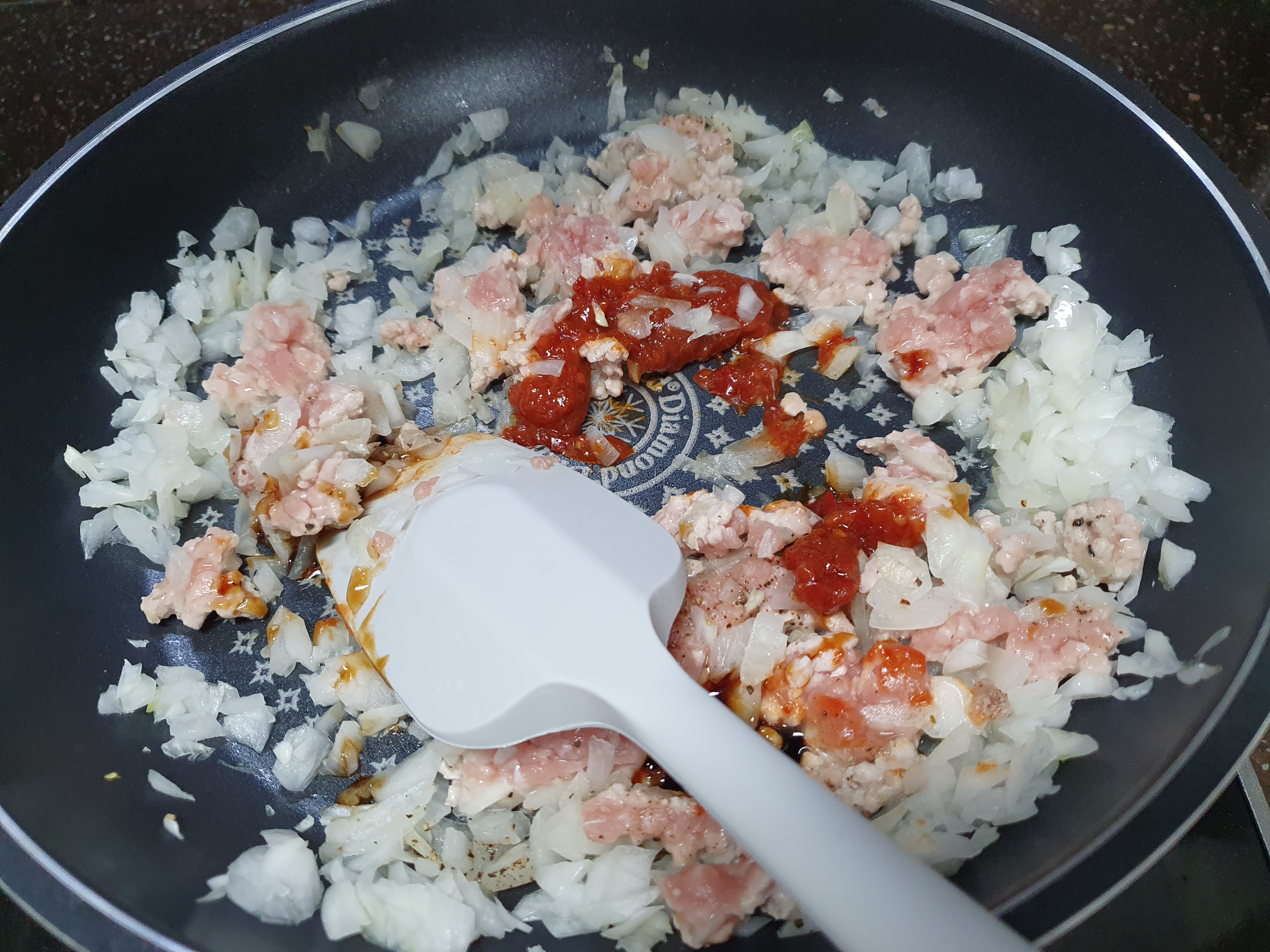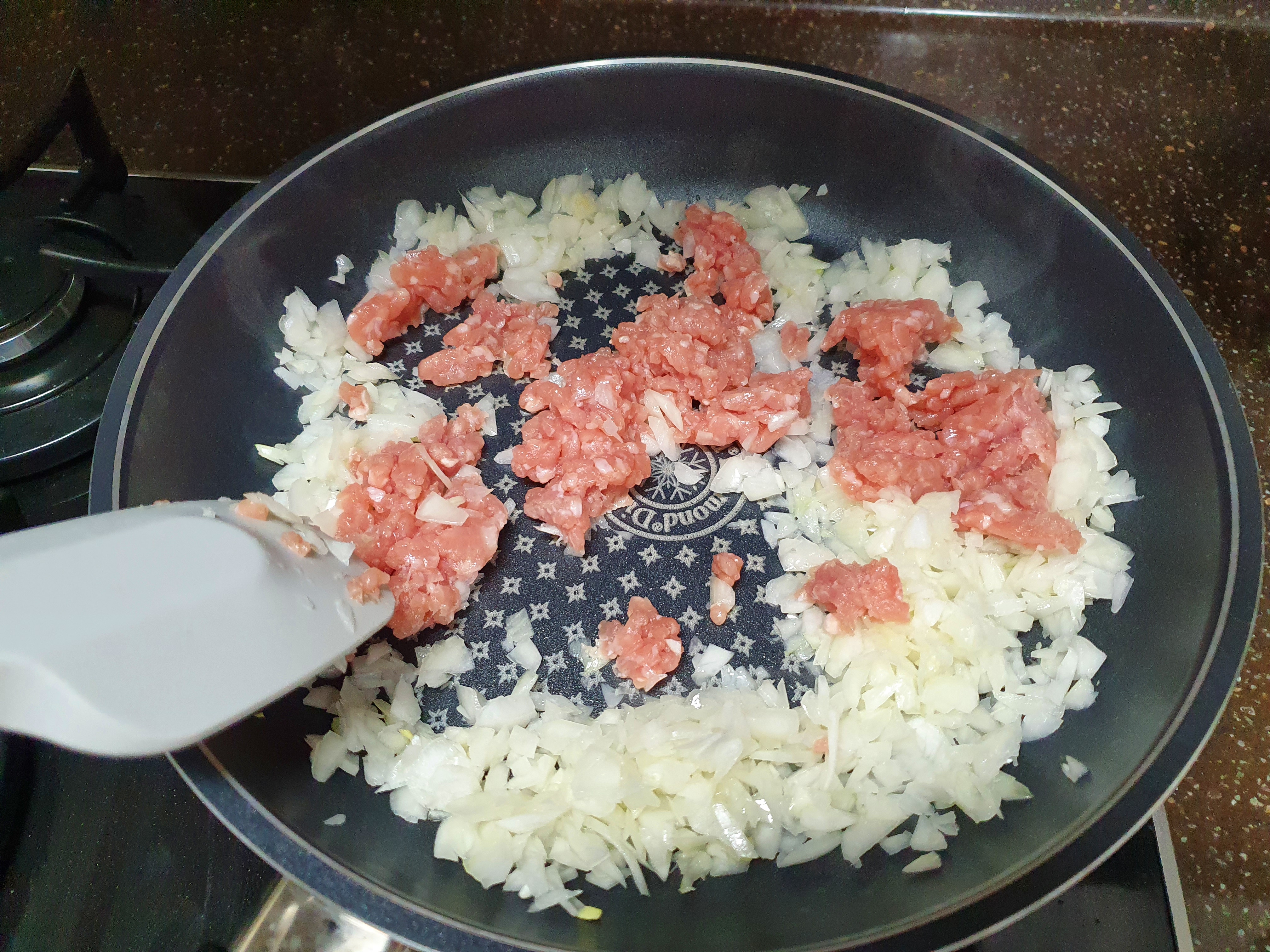 그리고 마트에서 구입한 돼지고기 뒷다리 다짐육이에요. 저는 다져져 있는 고기를 구입했는데요, 원하시는 식감에 따라서 다져져 있지 않은 고기를 사서 카레에 넣는 고기처럼 크게 썰어주셔도 되요. 양파를 기름에 둘러서 볶다가 다짐육도 넣어서 기름이 나올때까지 충분히 볶아주세요. 저는 중불에서 볶아주었어요.